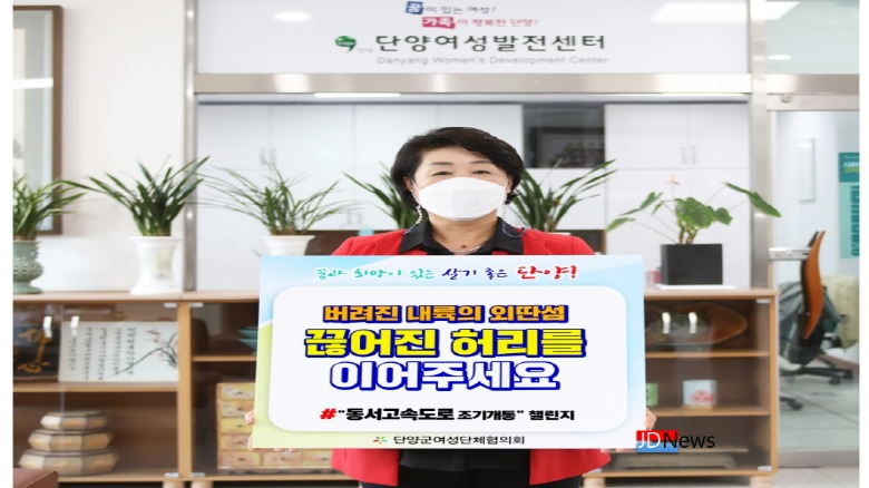 JD News 유소진 기자 = 단양군에서 국가균형발전의 뜻을 담아 류한우 단양군수가 첫 테이프를 끊었던 ‘동서고속도로 조기개통’ 챌린지의 후속 참여자로 이준배 단양경찰서장, 김혜숙 단양군여성단체협의회장이 캠페인에 동참했다.