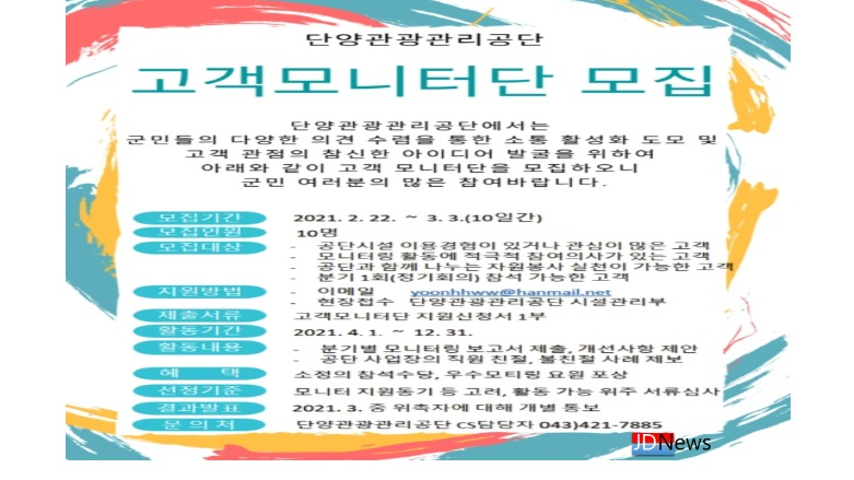 JD News 유소진 기자 = 단양관광관리공단이 고객과의 정기적인 의사소통 채널 구축을 위해 ‘제9기 고객 모니터단’을 오는 3월 3일까지 공개 모집한다고 25일 말했다.