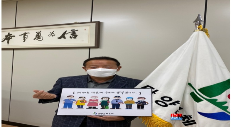 JD News 유소진 기자 = 단양군체육회 송종호 회장은 지난 26일 필수노동자에게 고마움을 전하는 ‘고맙습니다. 필수노동자’ 캠페인에 동참했다.
