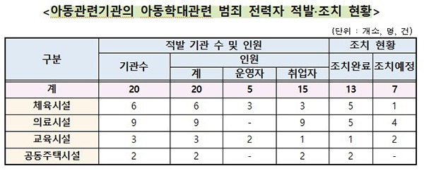 이에 따라 적발된 20명에 대해서는 지방자치단체장 또는 교육감·교육장이 해당 아동 관련 기관의 장에게 시설 폐쇄 또는 운영자 변경·취업자 해임 조치를 했다.