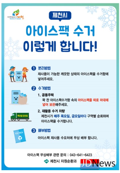 JD News 이용희 기자 = 제천시는 코로나19의 영향으로 비대면 쇼핑을 통한 아이스팩 사용량이 급격히 증가함에 따라, 주요 사업장을 대상으로 환경보호와 구입비용 절감을 위한 아이스팩 재사용 촉진에 나섰다.