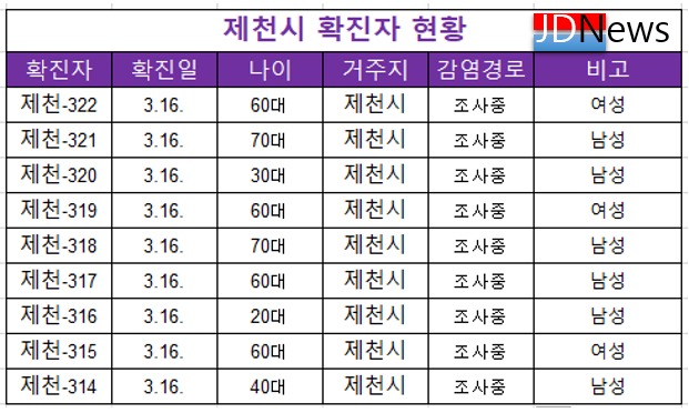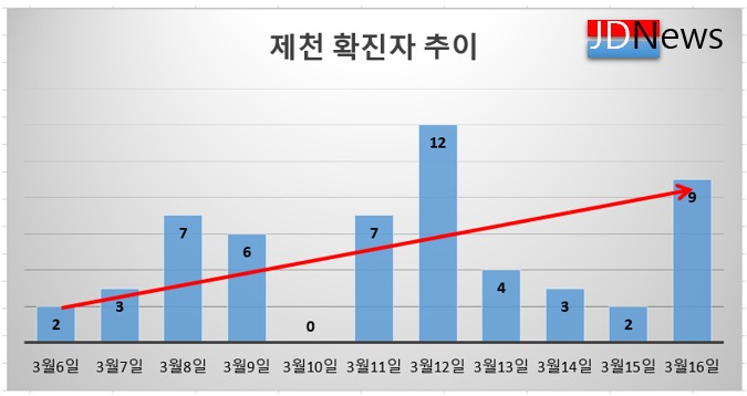 JD News 이용희 기자 = 제천 지역에 신종 코로나바이러스 감염증(코로나19) 확진자가 5명 추가 되며, 하루 확진자가 9명이 됐다.