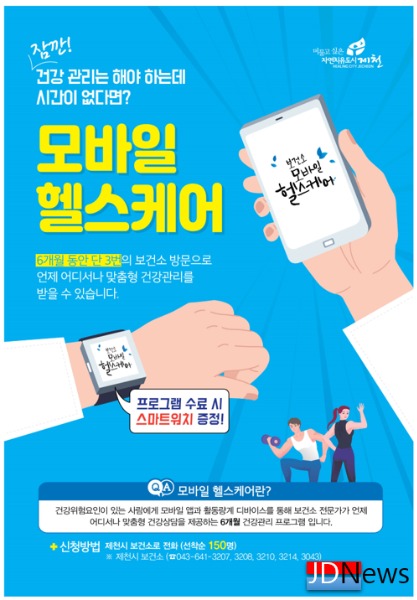 JD News 이용희 기자 = 제천시는 4월 15일까지 주민의 효과적인 건강관리를 위해 언택트 시대에 적합한 ‘2021 모바일 헬스케어사업’ 참가자 150명을 모집한다.