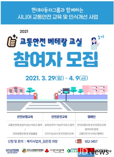 JD News 이용희 기자 = 제천시노인종합복지관은 3월 29일부터 4월 9일까지 교통안전에 관심 있는 어르신들을 대상으로 ‘교통안전 베테랑 교실’ 참여자를 모집한다고 밝혔다.