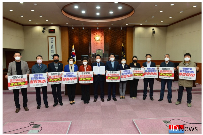 JD News 이용희 기자 = 제천시의회(의장 배동만)는 지난 29일 제천시의회 본회의장에서 「쌍용양회 폐기물매립시설 조성 결사 반대 성명서」를 발표했다.