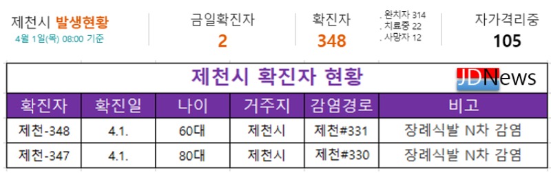 JD News 이용희 기자 = 제천의 한 장례식장발 신종 코로나바이러스 감염증(코로나19) 확진자가 N차 감염으로 2명 추가되면서 누적 확진자 수가 348명으로 늘었다.