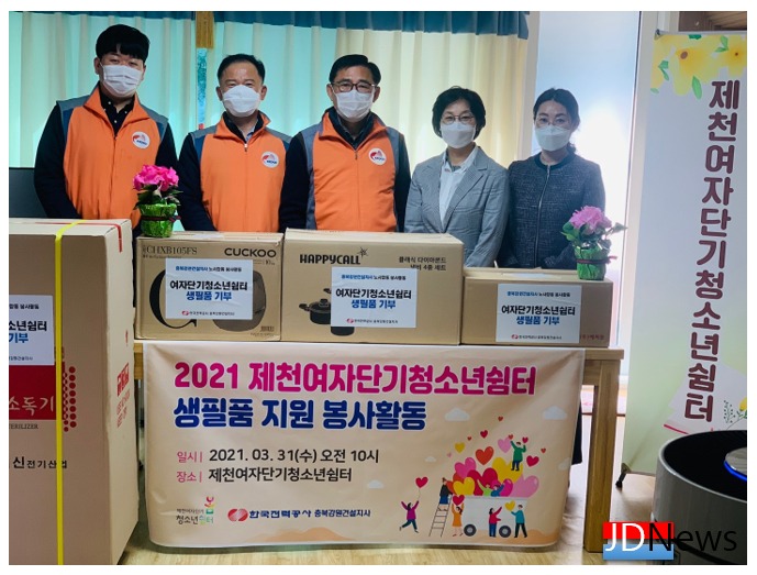 JD News 이용희 기자 = 한국전력공사 충북강원건설지사(지사장 김도화)는 지난 31일 위기청소년들을 보호하고 있는 제천여자단기청소년쉼터(소장 노정자)에 자외선살균소독기, 전기밥솥, 공기청정기 등 110만원 상당의 후원물품을 기탁하였다.