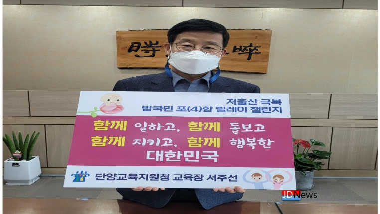JD News 유소진 기자 = 단양교육지원청 서주선 교육장은 12일 정구영 진천교육장의 지목을 받아 저출산이 가져올 국가 위기를 함께 극복하자는 ‘저출산 극복 범국민 포(4)함 릴레이’ 챌린지에 동참했다.