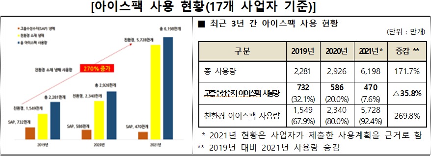 환경부가 2020년에 아이스팩 제조사를 대상으로 조사한 결과에 따르면, 2019년 대비 2020년 친환경 아이스팩 생산량은 2.24배(22%p)로 증가한 것으로 나타났다.