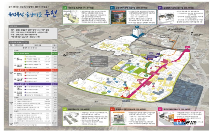이번 사업의 총사업비는 495억 원(국비 100억원, LH 216억원, 지방비 149억원, 도시기금 10억원 등)에 달하며 주천 중앙로 및 재래시장 개선사업, 귀촌인 정착 지원사업, 노후 주택·점포 정비사업, 공원조성 및 복합문화공간 조성 등 다양한 사업을 주민들과 함께 추진한다.