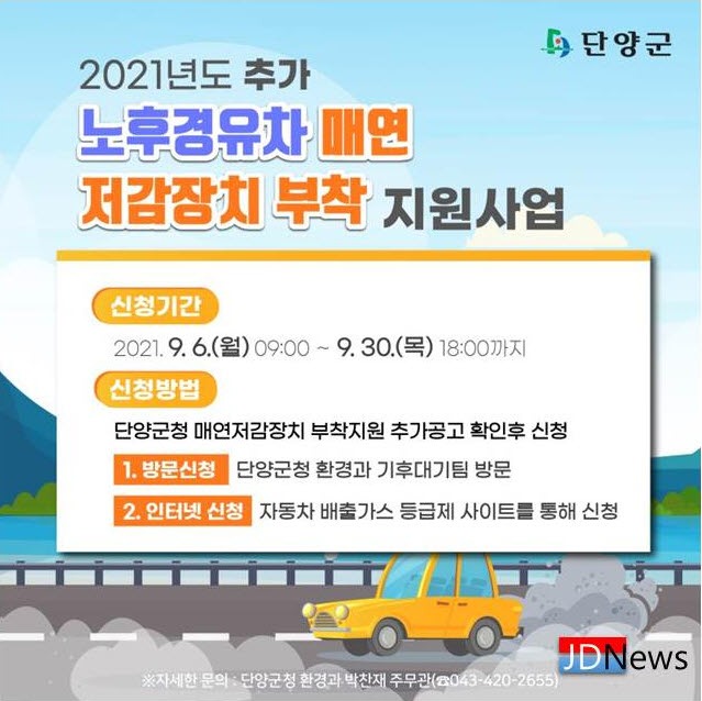 JD News 석의환 기자 = 단양군이 노후 경유차에서 발생하는 대기오염물질 저감을 위해 사업비 4억 1,000만원을 투입해 107대 차량에 매연저감장치(DPF) 지원 사업을 추진한다.