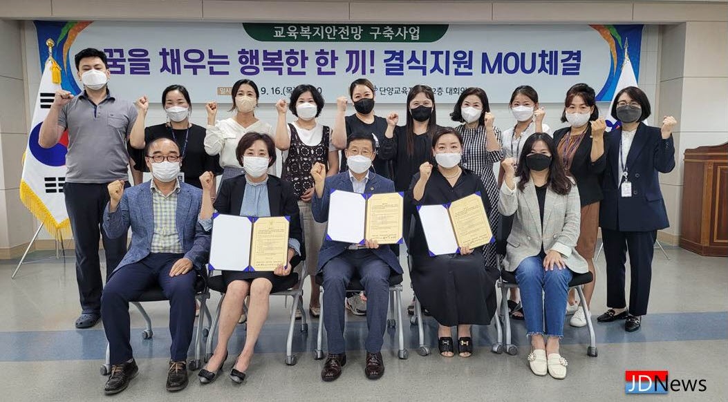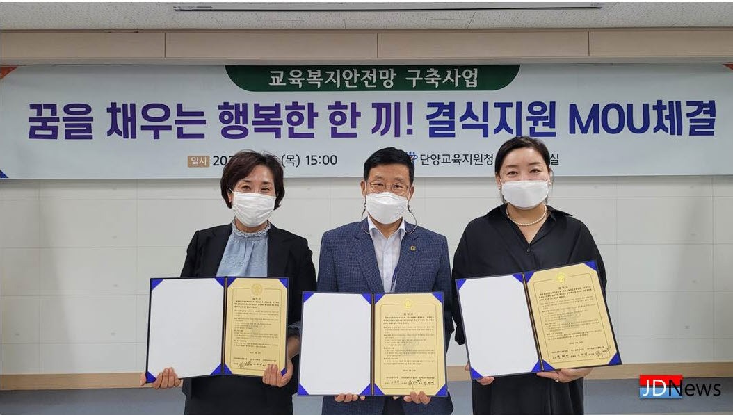 JD News 유소진기자 = 단양교육지원청(교육장 서주선)은 취약계층 학생들을 위해 단양로컬푸드협동조합, 단양군학교학부모연합회와 16일 결식지원 MOU를 체결하였다.