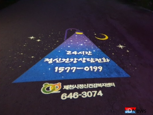 23일 제천시에 따르면 시민들이 많이 이용하는 산책로에 로고라이트를 이용하여 '오늘 참 힘들었죠? 당신의 마음을 비춰드릴게요', '내가 해 줄게요 위로, 당신에게 1순위로' 등의 문구를 담아 자살예방에 대한 거부감을 해소하고 생명존중 문화를 홍보한다는 취지라고 밝혔다.