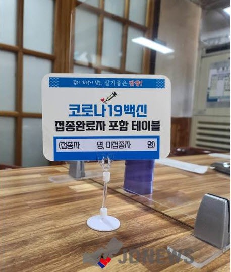 JD News 석의환기자 = 관광1번지 충북 단양군 음식점 테이블에 코로나19 예방접종 완료자가 포함된 식사 자리임을 알 수 있는 안내판이 놓인다.