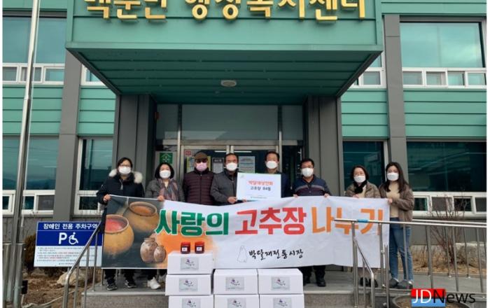 ▲ 박달재 전통시장 상인회 기탁식JD News 이용희 기자 = 박달재전통시장상인회에서는 지난 10일 백운면행정복지센터(면장 이현우)를 방문해 백운면 주민들에게 전해달라며 직접 담근 고추장을 84세트를 전달하였다. 상인회는 매년 ‘사랑의 고추장 담그기’ 행사를