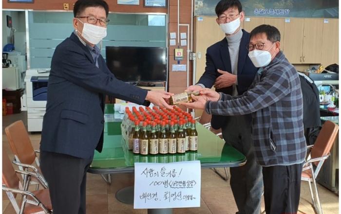 ▲ 들기름 기탁모습JD News 이용희 기자 = 단양군 영춘면(면장 김기영)은 하1리 배선경 이장과 남천2리 최영선 이장이 영춘면사무소를 찾아 직접 짠 사랑의 들기름을 전달했다고 14일 밝혔다.전달된 들기름은 소주병 크기로 100병(180만원 상당)으로 두 이