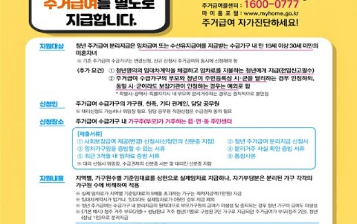 (제천=Jd News) 이용희 기자 = 국토교통부(장관 김현미)는 내년부터 청년 주거급여 분리지급(이하 “청년 분리지급“)을 시행하고 12월1일부터 사전신청을 받는다고 밝혔다.청년 분리지급은, 취학․구직 등을 목적으로 부모와 떨어져 거주하는 청년의 경우, 열악