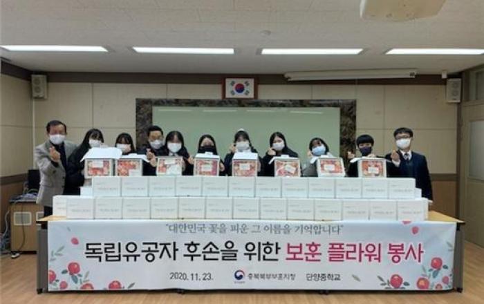▲ (왼쪽)김명수 단양중 교장선생님 (맨오른쪽)경종호 충북북부보훈지청 보훈과장 충북북부보훈지청(지청장 박종덕)은 23일, 단양중학교(교장 김명수)와 “대한민국 꽃을 피운 그 이름을 기억합니다.” 봉사활동을 진행하고 독립유공자를 위한 보훈 플라워 박스