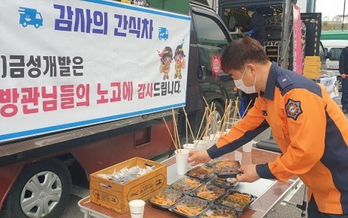 (제천=Jd News) 이용희 기자 = 제천소방서(서장 한종우)는 24일 오전 8시부터 10시까지 ‘사랑의 간식차’가 제천소방서를 찾았다고 밝혔다. 금성개발(주)과 대한민국재향소방동우회에서 후원하는 이날 행사는 코로나 사태 및 재난 재해의 최전선에서 고생하는