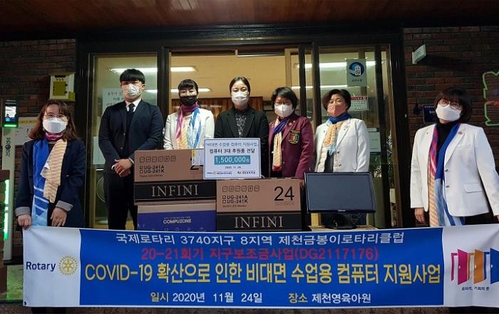 (제천=Jd News) 이용희 기자 = 제천금봉이로타리클럽(회장 도원 고순덕)은 이번 코로나-19 확산으로 수업용 전자기기가 부족했던 제천영육아원(원장 강숙진)을 방문하여 컴퓨터 3대(150만원 상당)를 후원했다. 지난 달 24일 전달식에 참석한 고순덕 회장
