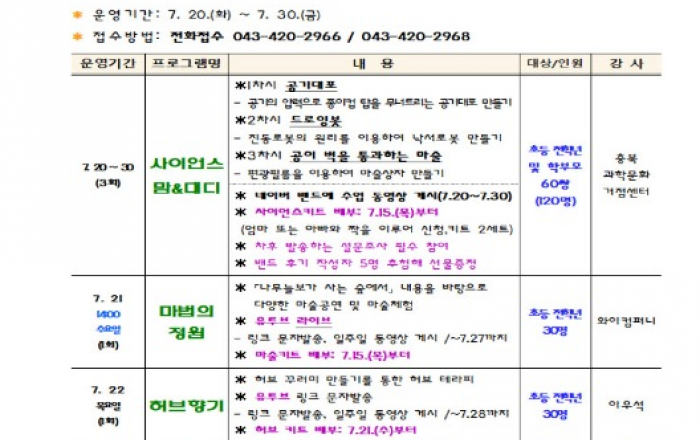 ▲ 단양군 다누리도서관의 비대면 여름방학 특강 3개 프로그램 운영 계획표JD News 유소진 기자 = 단양군 다누리도서관이 여름방학을 맞은 초등학생 및 학부모를 대상으로 오는 20일부터 30일까지 열흘간 다채로운 비대면 여름방학 특강 3개 프로그램을 운영한다. 19일