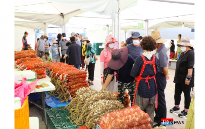 ▲ 지난 16일 진행된 단양군 다누리센터 광장 단양황토마늘 직거래 행사 모습JD News 유소진 기자 = 단양군이 지역 내 확산되는 신종 코로나바이러스 감염증(코로나19)연결고리 차단을 위해 오는 23∼25일 다누리센터 광장에서 예정된 단양황토마늘 직거래 행사를 취소했
