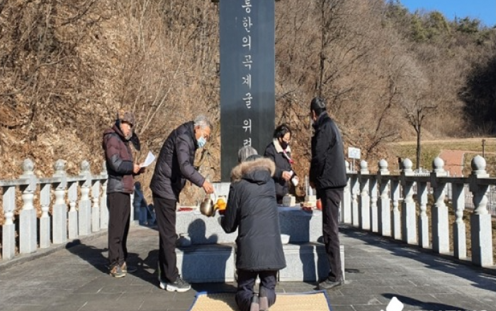 ▲ 제71주기 단양곡계굴 합동위령제 모습충북 단양군은 1951년 한국전쟁 당시 미군 폭격으로 숨진 민간인 희생자의 넋을 기리기 위한 ‘제71주기 단양곡계굴 합동위령제’를 영춘면 곡계굴 위령비 광장서 거행했다.17일 단양군에 따르면 이번 위령제는 코로나 확산 방지를 위해