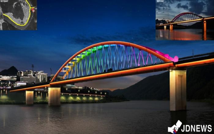 ▲ 단양읍 고수대교 미디어 브릿지 예상도 모습 충북 단양군이 도심 야경 명소화를 통한 신성장 관광산업 육성을 목표로 경쟁력 있는 빛의 도시 조성에 박차를 가한다.6일 단양군에 따르면 최근 도시 조명이 어둠을 밝히는 기존 역할을 넘어 도시에 활력을 불어