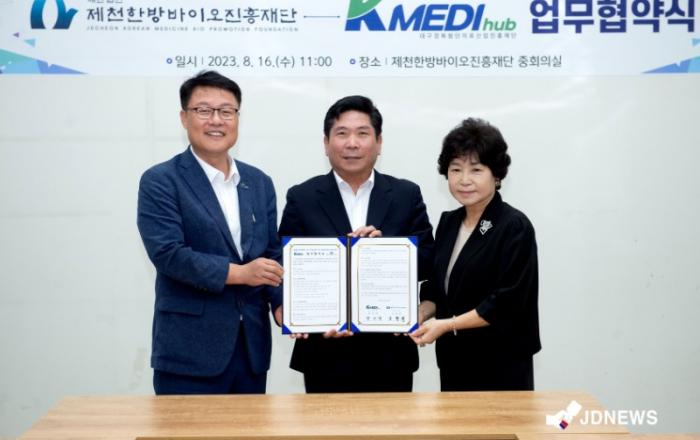 ▲ 한방바이오진흥재단 업무협약 체결제천한방바이오진흥재단(이사장 조정희)은 지난 16일 대구경북첨단의료산업진흥재단(케이메디허브, 이사장 양진영)과 한의약 산업의 발전을 위한 협력체계 구축을 위한 상호 업무협약을 체결했다.이번 업무협약은 글로벌 한의약산업 기반 구축 및 국