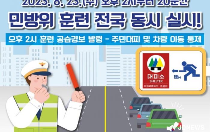 ▲ 민방위훈련 포스터제천시는 적 공습에 대한 국민 대응 역량을 강화하기 위해 오는 23일 오후 2시부터 20분간 공습 대비 민방공 대피훈련을 실시한다고 밝혔다.훈련 당일 오후 2시 공습경보가 발령되면 보행 중인 시민은 가까운 민방위 비상대피시설 또는 건물 지하로 대피해