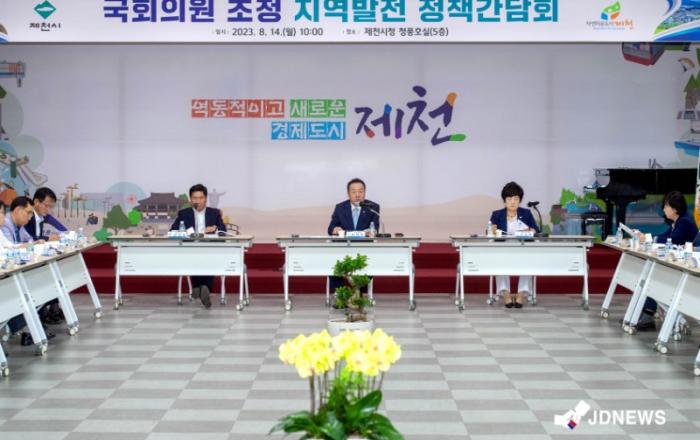 ▲ 정책간담회제천시는 14일 시청 청풍호실에서 지역 국회의원 초청 지역발전 정책간담회를 개최했다. 간담회에는 김창규 제천시장과 엄태영 국회의원, 이정임 제천시의회 의장, 김꽃임·김호경 도의원 및 시의원, 제천시 관계자들이 참석하여 제천시의 주요 현안사업과 2024년