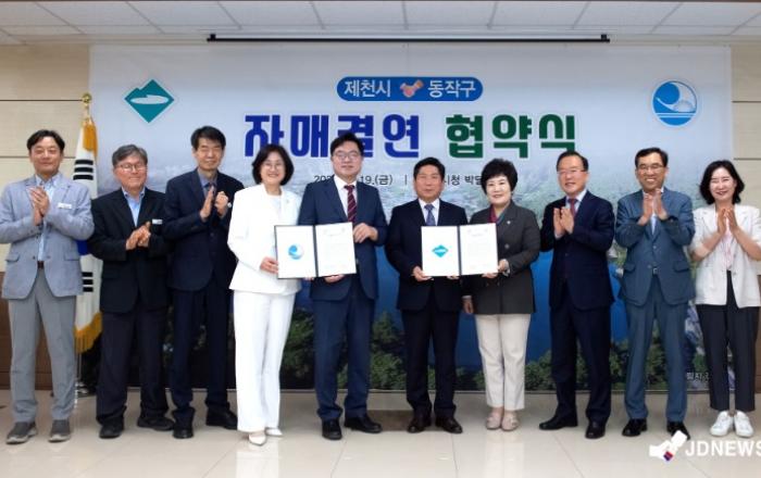 ▲제천시-서울동작구 자매결연 협약식 제천시와 서울 동작구(구청장 박일하)가 최근 제천시청에서 양 지자체 공동발전을 위한 자매결연 협약을 체결했다. 지난 19일 김창규 제천시장 및 박일하 동작구청장이 참석한 가운데 체결된 이번 자매결연은 지난 해 8월 동작구에
