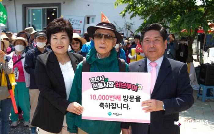 ▲ 제천시 러브투어 1만번째 손님 방문 제천시가 15일 청풍면 일원에서 ‘전통시장 러브투어 1만번째 방문객 환영식’을 했다.환영식엔 김창규 제천시장, 이정임 제천시의회 의장 등이 참석한 가운데, 1만번째 행운은 군포시니어클럽 노인사회활동지원사업 참여노인 중 한