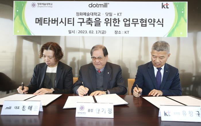 KT 강북강원광역본부가 실감 미디어 전문 업체 닷밀, 정화예술대학교와 함께 ‘메타버시티(Metaversity)’ 구축을 위한 업무협약을 체결했다고 20일 밝혔다. 이번 업무협약으로 3자는 정화예술대학교에 실감미디어를 적용한 디지털 트윈 ‘메타버시티’를 구축하기로 협의