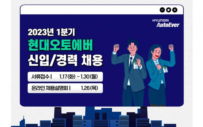 현대오토에버가 올해도 대규모 인재 채용을 이어간다. 현대오토에버는 1월 17일부터 2023년 1분기 신입·경력 사원 채용을 시작한다고 공고했다.현대오토에버는 차량 소프트웨어(SW) 및 엔터프라이즈 IT와 클라우드·인공지능(AI)·빅데이터 등 모빌리티 생태계의 새로운 가