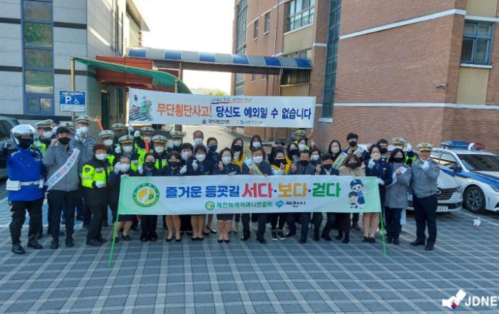 ▲교통캠페인제천녹색어머니 연합회(회장 윤혜진)는25일 내토중학교에서 등굣길 교통안전 및 학교폭력예방 합동캠페인을 실시하였다. 이날 캠페인에는 제천경찰서, 모범운전자회, 녹색어머니회, 제천교육지원청, 내토중학교 교직원 등 100여 명이 참석하여 서다!보다!걷다! 3원칙의