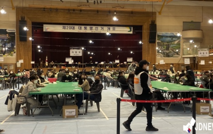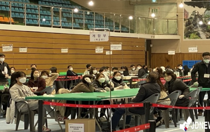 ▲ 제20대 대통령선거 개표현장(9일 제천체육관 사진=유소진기자)제20대 대통령 선거 개표가 진행 중인 가운데 9일 오후 10시기준 충북 제천 지역 투표수 집계가 현재까지 총 10,493표로, 집계가 진행중에 있다.현재 중앙선거관리위원회(이하 중앙선관위) 개표진행상황에