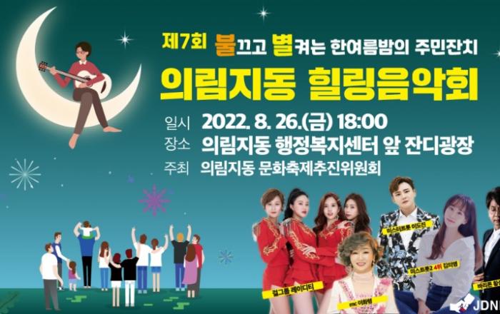 ▲제 7회 의림지동 힐링음악회 포스터의림지동 한여름 밤의 주민잔치 "제7회 의림지동 힐링음악회"가 이달 26일(금) 저녁 6시 의림지동행정복지센터 잔디광장에서 개최된다. “의림지동 힐링음악회”는 7회 째를 맞이하고 있는 행사로 코로나19로 인해 중단되었다가 3년
