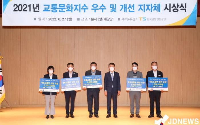 ▲교통행정과_교통문화지수 1위 시상식 수상 사진교통문화 향상을 위해 매년 국토교통부 주관으로 실시하는 교통문화지수 실태조사 평가 우수 지자체에 대한 시상식이 지난 27일 한국교통안전공단에서 개최되었다.이날, 원주시는 인구 30만 이상 시 중 1위로 선정되어 국토교통부