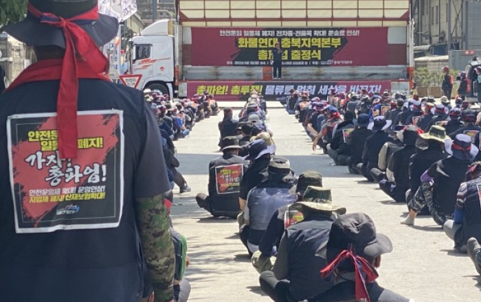 ▲ 7일 화물연대 충북본부가 한일시멘트 단양공장에서 총 파업 출정식을 열었다. (사진=유소진기자)전국 민주노동조합총연맹 공공운수노조 화물연대(이하 화물연대)의 총 파업으로 시멘트 생산업체가 밀집돼 있는 충북 제천·단양 각 시멘트사의 시멘트 출하가 전면 중단되는 등 운송