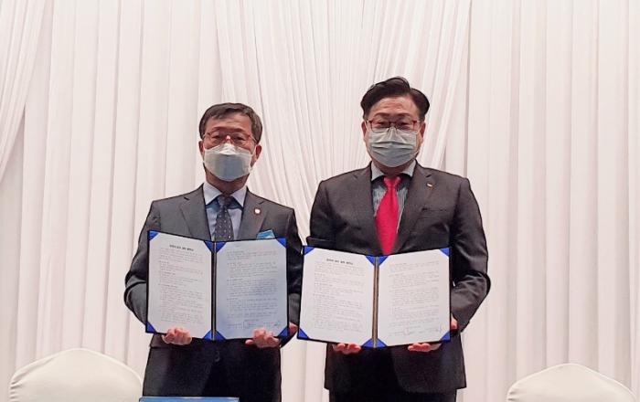 ▲최봉규 중소기업융합중앙회장(왼쪽)과 박철우 탑스텐리조트 동강시스타 본부장이 상생협약을 체결한 후, 기념촬영하고 있다. <사진=동강시스타>탑스텐리조트 동강시스타(대표 정환오)와 중소기업융합중앙회(회장 최봉규)는 18일 강원도 영월소재 동