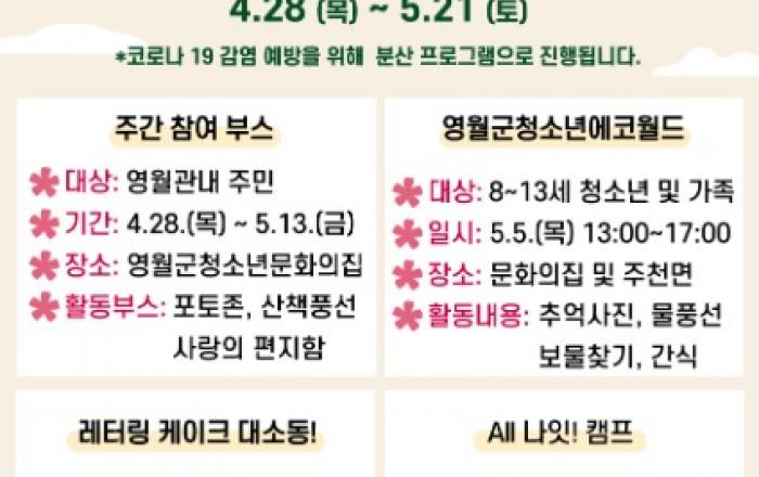 ▲5월 어린이날 축제 포스터강원 영월군청소년문화의집((사)아름다운청소년들)은 가정의 달을 맞이해 ‘5월 어린이날 축제’를 4월 28일에서 5월 21일까지 개최한다고 밝혔다.‘5월 어린이날 축제’는 청소년운영위원회 ‘옹달샘’, 동아리연합회 ‘M.B.T.I’, 청소년 자원