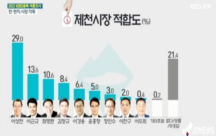 ▲ 왼쪽 순서대로 이상천 현 시장, 이근규 전 시장, 최명현 전시장전국 자치단체장을 선출하는 6·1 지방선거가 5개월을 앞둔 가운데 제천시장 적합도 조사에서 이상천 현 제천시장이 선두를 달리고 있는 것으로 나타났다.KBS 청주방송국의 여론조사 결과에 따르면 제천시장 후