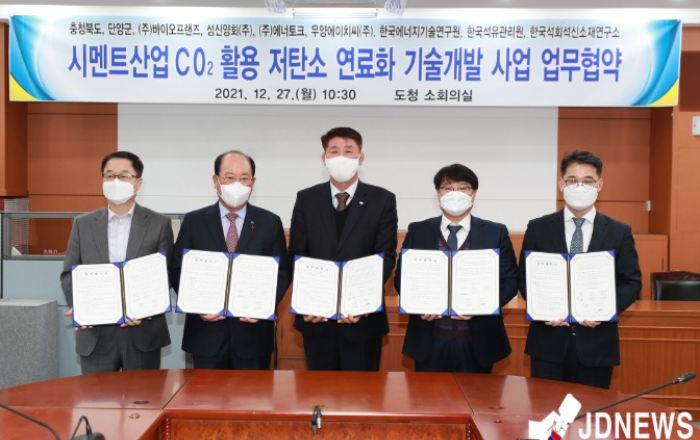 ▲ 단양군이 산업통상부 주관 탄소중립 기술개발 사업 공모 과제에 선정돼 지난 27일 충북도청에서 시멘트산업 CO₂ 활용 저탄소 연료화 기술개발 사업 업무협약을 맺었다.충북 단양군이 기후 위기 대응을 위한 청정연료 생산기지 특화로 탄소중립 선도도시로 우뚝 선다.30일 단