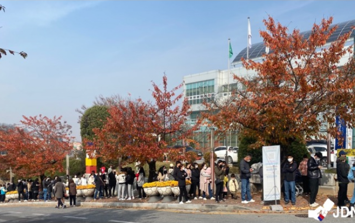 ▲ 제천시보건소 선별진료소 앞에 검체검사를 받기 위해 시민들이 길게 줄지어 대기하고 있다.충북 제천시 신종 코로나바이러스 감염증(코로나19) 확진자 16명이 발생하면서 방역당국에 비상이 걸렸다.8일 오전 8시경 확진판정을 받은 16명 중 신규확진자는 15명과 격리중 확