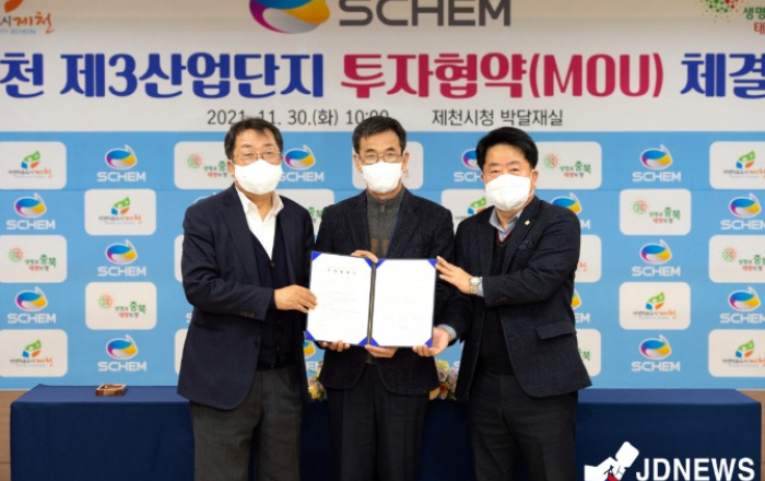 ▲ 30일 제천시가 ㈜에스켐과 400억원 규모의 제3산업단지 공장 신설 투자협약을 체결했다.30일 충북 제천시가 제2산업단지 입주 기업인 ㈜에스켐과 400억원 규모의 제3산업단지 공장 신설 투자협약을 체결했다.이날 협약식에는 이상천 제천시장, 배동만 제천시의회 의장,
