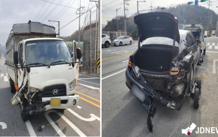 ▲ 18일 오전 왕암동 산업단지내 BGX 생명과학 앞 큰 사거리에서 트럭과 승용차가 추돌 했다. (사진=독자제공)18일 충북 제천시 왕암동 산업단지내 사거리에서 트럭과 승용차가 추돌하는 사고가 발생했다.이날 사고는 오전 10시 40분경 왕암동 산업단지내 BGX 생명과학