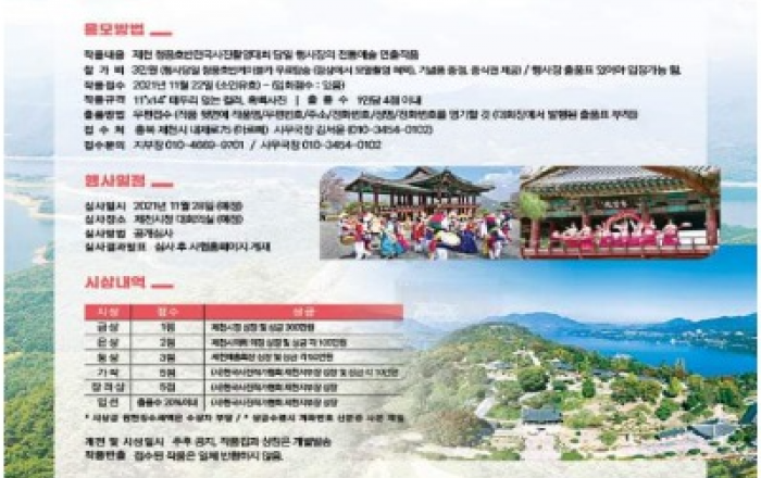 ▲ 2021 제천 청풍호반 전국사진촬영 대회 포스터JD News 유소진 기자 = 사단법인 한국사진작가협회 충북 제천지부에서 오는 7일 청풍문화재단지와 청풍호반 케이블카 정상에서 ‘청풍호반전국사진촬영대회’를 개최한다고 5일 밝혔다.신종 코로나바이러스 감염증(코로나19)로