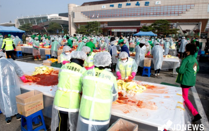 ▲ 지난 5일 제천체육관 주차장에서 새마을지도자 및 회원 150여명이 모여 김장나누기 행사가 열렸다.JD News 유소진 기자 = 충북 제천시새마을회는 지난 5일 제천체육관 주차장에서 새마을지도자 및 회원 150여명이 모인 가운데 ‘2021 사랑의 김장나누기’
