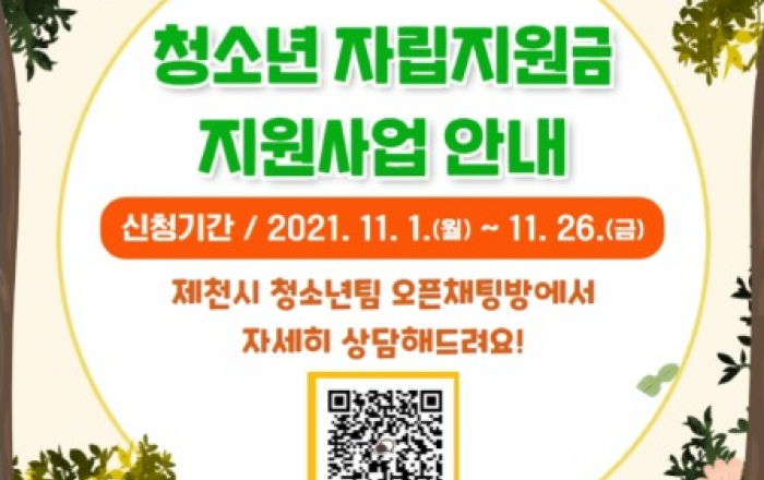 ▲ 청소년 자립지원금 지원사업 안내 포스터JD News 유소진 기자 = 충북 제천시가 저소득 청소년들에게 학자금 및 지업훈련금 등 자립지원금을 지원하는 ‘2021년 하반기 청소년자립지원금’ 을 오는 11월 1일부터 11월 26일까지 신청 받는다. 지원대상은 제천시